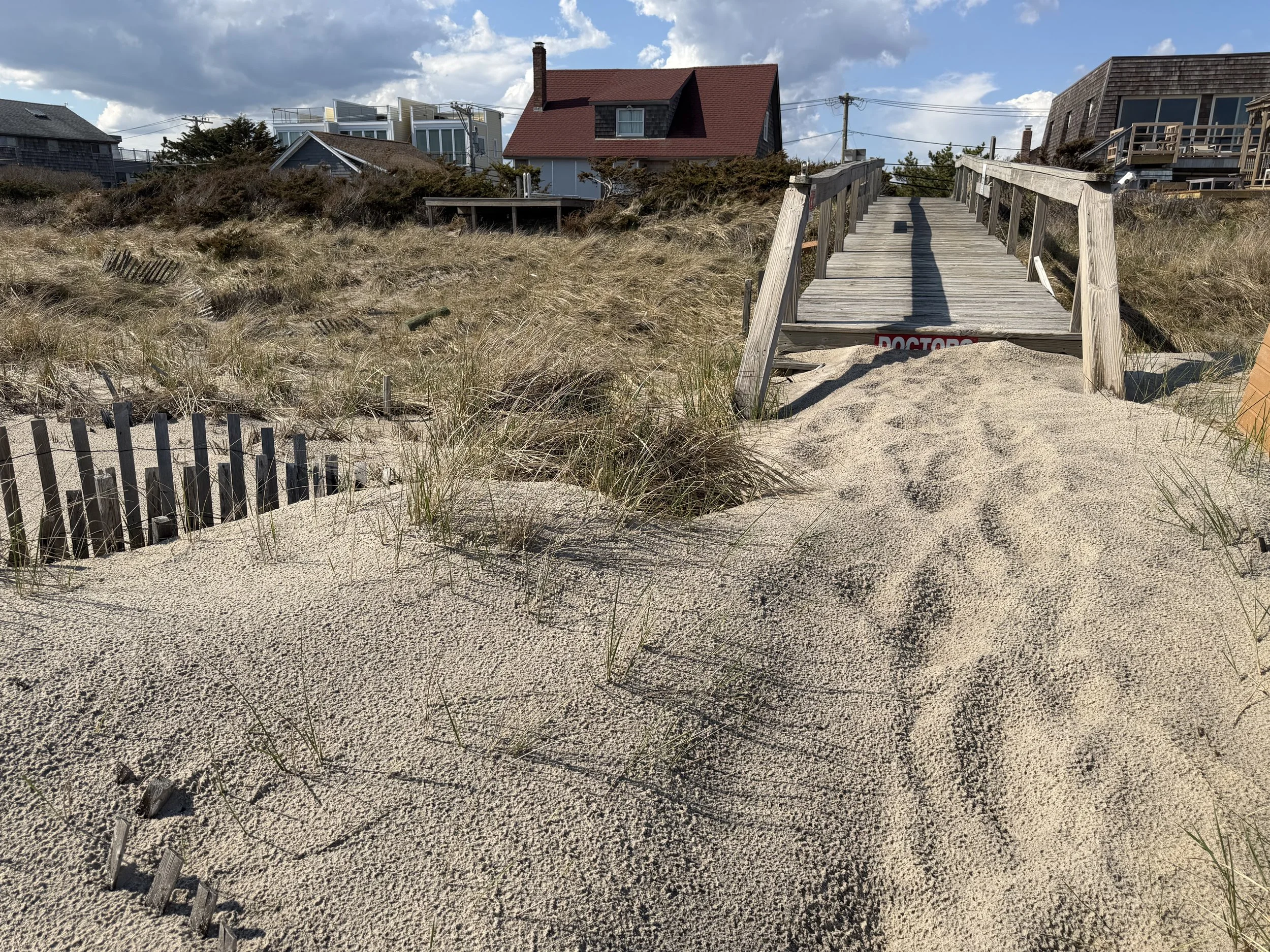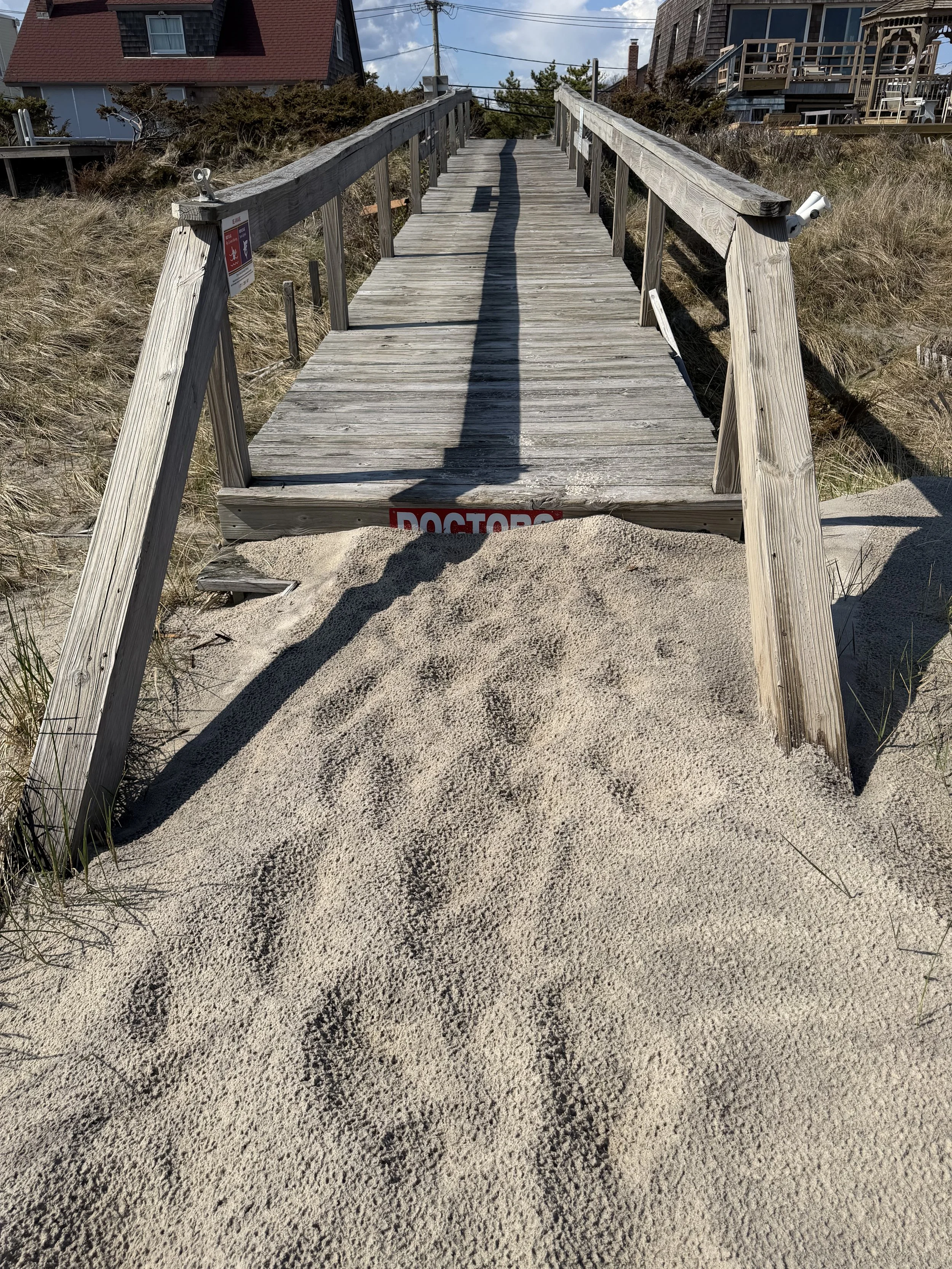 Wooden beach walk buried by winter sand accumulation, Fire Island