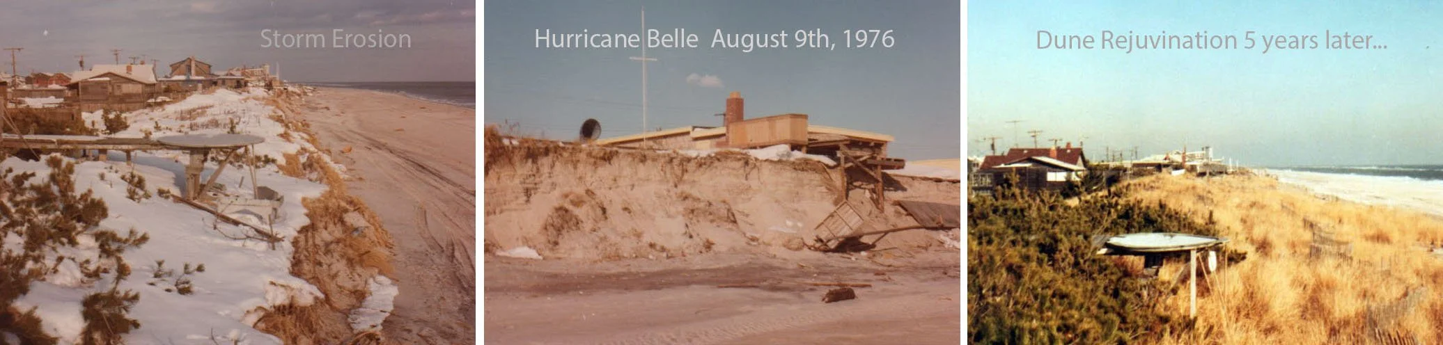 Steps removed in the storm of 1976 were later rebuilt forward, not immediately, but as the dune returned. They are not visible in this image, as the dune restored through the serpentine method, 1976–1981. Cherry Grove